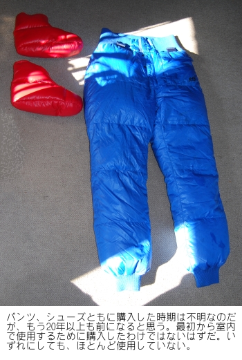 さすがにその日は、机に向かっていても、普段、下半身をつっこんでいる寝袋だけでは対応できず、羽毛のパンツ(ズボンのようなもの)を履いて寒さをしのいだ。いざとなれば、羽毛のシューズもある。「どこからでもかかってこい!」という感じである。