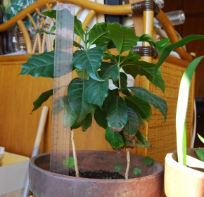 あと何年くらいかかるかは分からないが、もし順調に育ってくれれば手の指の爪くらいの大きさの赤い実をつけてくれるはずである。確かその種は緑色だったように記憶している。それを焙煎しドリップするのだ。「きっと美味しいのだろうな〜」などと想像すると今にもよだれが出てきそうだ。そうすれば「さらばインスタントよ!」となる。でも、その前に温室を作らないといけなさそうだ。