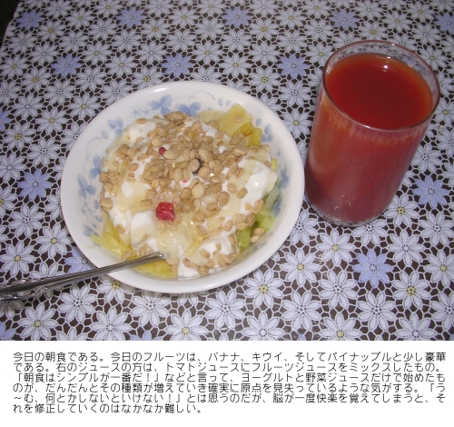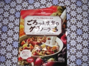 現在食べているものは日清の「ごろっと果実のグラノーラ」で、内容量は280gである。毎朝、一握りくらいの量をヨーグルトに振りかけているが、1袋で2週間以上はもっているようなきがする。袋をよく見ると「食物繊維たっぷり」と印字されているが、すでに私は「食物繊維過多な食生活」を突っ走り、そのマイナス面もひしひしと感じているわけで、「ノーモア食物繊維!」という感じがしないでもない。
