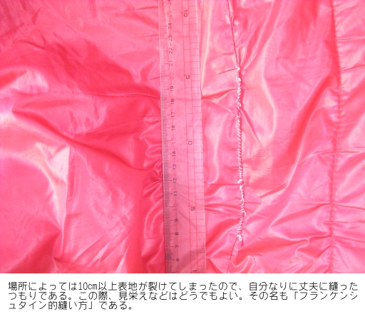 それゆえに、表地はお世辞にも「丈夫」とは言い難い。私の寝袋も例外ではなく、去年あたりは、場所によってはかなり大きく生地が裂け、中のシンサレート(見た目は綿状)が見えるようになってしまった。それでも、その避けたところから出てくるわけではなかったのでしばらくそのまま使用していた。(これが羽毛だったら大変である)ただ、これからの長期にわたる使用を考えたら、さす