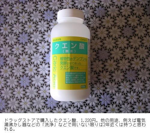 今回、クエン酸以外は全てネット通販で購入した。もう何回も購入しているショップである。クエン酸は近くのドラッグストアで購入したのだが、サプリメントというよりは、「酸味」を与えると他のサプリメントが飲みやすくなるのでいつも購入している。
