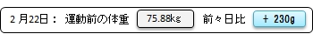 前日、「ちょっと食べすぎちゃったかな〜」という感覚があり、76`は間違いなく超えていると思っていたのだが、結果的には76`を切っていた。やっと下がる傾向になってきたのかな…。ちょっと、ウレピー!