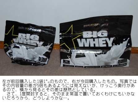 今月の4日の日記「プロテイン倍増計画」で、コンテストまでの期間「プロテインの摂取量を倍にする」と記したわけだが、その時には、手元のプロテインの1`入りのものが最後の1袋になっていたので注文しなければならなくなっていた。