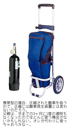 据え置き型は、基本的に電源はONにしたままである。使用しないときもあるが、こまめに電源を切ることはしていない。それに対して、携帯型はボンベに高濃度の酸素が圧縮された形になっていて、必要な時にだけボンベの栓を開いて使用することになる。先日、3ヶ月に1度の泌尿器科への通院があったので初めて使ってみた。