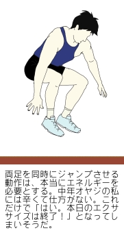 一言に「ジャンプ系の動作」と言ってもいろいろあり、その強度も同じではない。特に辛いのが、両足を同時に上げるタイプである。よくサッカーの選手がウオーミングアップで行っているのを見かけたりする。