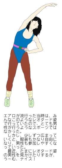 当時、エアロというと、レオタードに長めのソックスを履いている女性のイメージしかなく、それはもう100%女性が行うスポーツ以外の何物でもなかった。プラスして、それはフィットネスクラブで行うスポーツであり、当時のフィットネスクラブは、現在のように高校生でも会員になれるような手軽なものでは決し