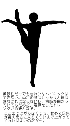 足を、膝をしっかりと伸ばしたまま高く上げていくには太ももの裏の筋肉であるハムストリングスの柔軟性が特に求められる。おそらく、フロアに長座(足を前に伸ばして座る)の形から前屈をした場合、それこそ胸が太ももに着くくらいの体の柔らかさが必要になってくると思われる。そうでないときれいなハイキックはできない。