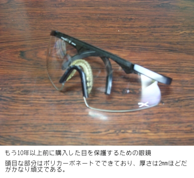 かなり風が強い日しか使用しないので、年に数回ほどしか着用することはないし、今まで「着用していて良かった!」などという場面はないのだが、「備えあれば患いなし」である。目はとても大切な器官で、ちょっと大げさかもしれないが「失明」でもしたら一大事である。しっかりと保護していかなければならない。