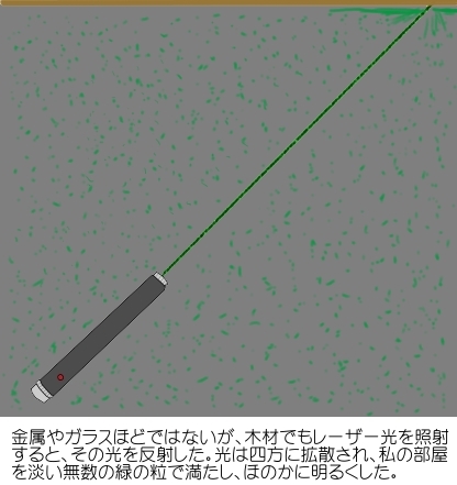 「ついに手に入れたぞ!」と思わざるを得なかった。天井だけでは飽き足らず、部屋のいろいろなところにレーザー光を照射してみた。鏡などはレーザー光を反射したし、蛍光灯などは1ヶ所に当てただけで全体が緑色に光った。購入してから1週間くらいは、毎晩、「天体ショーだ!」といって、部屋のあちこちにレーザー光を照射して一人悦に入ったわけである。