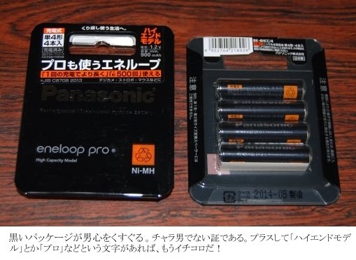 それで、その黒いエネループだが、商品名は「Panasonic eneloop pro」で「1回の充電でより長く、約500回使える」という宣伝文句である。「より長くって、どれくらい長く使えるのだろう?」と見てみると、「容量」が「900mAh」となっている。私が今まで使用してきたものが「750mAh」なので、数字だけで見ると約1.2倍ということになる。