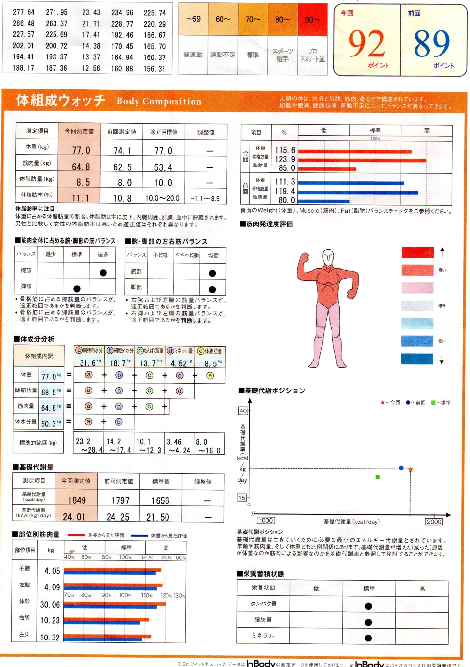 さて、一番気になる「体脂肪量」だが、その印字された数字を見ると「8.5`」となっている。ただ、その数字だけを見てもピンと来ないので、すぐ横に印字されている前回の数字を見ると「8.0`」である。つまり、0.5`しか増えていないことになる。