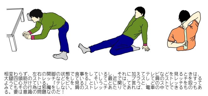 私の場合、「ながらストレッチ」は相変わらず続けてはいるが、もう何年も前から柔軟性は限界に達し、それ以上柔らかくなることはない。もちろん、だからと言って「これ以上柔らかくならないのだったらや〜めた!」となるようなこともない。止めてしまえばだんだんと硬くなっていくのは目に見えている。現状維持のためにもストレッチは常に意識していかなければならない。