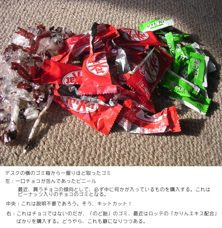 ただ、10日ほど前のことである。無性に(excessively)「う〜っ、チョコ、食いて〜!」という衝動(impulse)に駆られてしまった。しかも、夜中の1時過ぎ、何回か「コンビニに買いに行こうかな」と思ったが、その都度、「夜も遅いし、せめて買うにしても明日にしよう!」と自分に言い聞かせた。