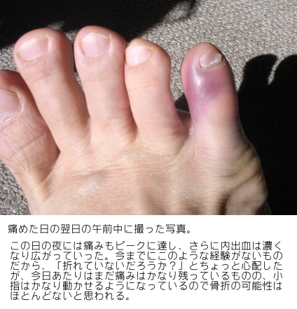 その後は腹筋などをしてみたが、痛みがだんだんと増してきてとても気持ちが入らなかった。裸足になって確認してみると右足の小指が赤くなっている。こうなると、痛みもあってほとんど「やる気モード」ゼロ状態。痛めたところをこのまま放置しておくわけにもいかなかったので、スタッフに言ってアイシングの道具を借りた次第である。