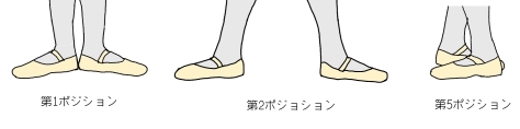 番号がついていて、左から第1、第2、そして第5ポジションとなる。ご覧になって分かるように、いずれも基本的には「股関節の外旋」(つま先を外側に向ける)が基本となっている。