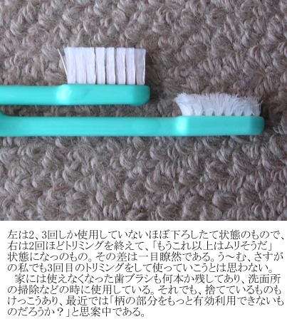 「歯ブラシの毛先が曲がる ⇒ 使いづらくなる⇒ 曲がった毛先をカットする ⇒ 使いやすくなる」という発想は、今となってはごく自然の流れのような気がするが、かく言う私も、実行に移し始めたのはここ3、4年くらいの間である。20代、30代ではそのような発想は、「貧乏くせ〜」と考えられなかったに違いない。