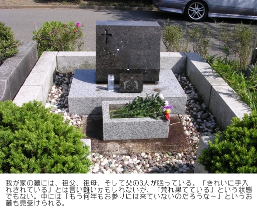 墓石の周りの雑草を取り、水をかけて軽くスポンジで墓石の汚れをきれいにして花とお酒を供えてすぐに帰路に着いた次第である。お酒は、父親はほとんどお酒を飲まなかったが祖父が酒豪だったために供えたもの。帰路の車の中で、「あれっ、そういえば手などを合わせて拝むことはしなかったな〜」ということに気が付いたのだが、「とりあえず父親も「来てくれた」ということは認めてくれるだろう。まあ、いいかっ!」と納得。