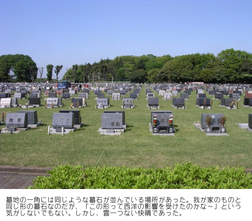 昨日は本当にいい天気だった。朝、6時に家を出たのだが、一応、暦上は平日だったので、通勤ラッシュもあったのだろうが、利用した高速道路は事故の影響で途中ノロノロ運転をしなければならないところもあり、千葉県の松戸にある霊園に着いたのは8時を回っていた。
