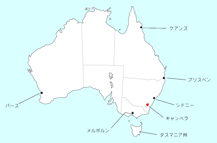 「シドニー!」などという答えも聞こえてきそうであるが、オーストラリアの首都はキャンベラとなる。その他、メルボルン、ブリスベン、パースなどの都市名やタスマニアなどは州名はよく耳にする。