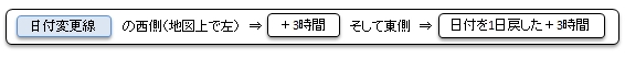 さて、「時間帯が東(地図上で右)に3つずれた場所」つまり、日付変更線がある時間帯だが、その日付変更線のために注意が必要である。