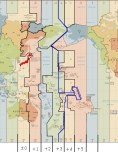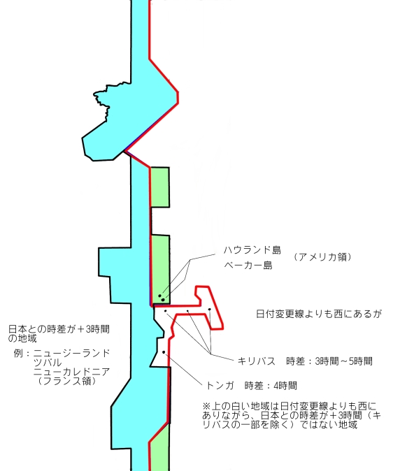 ・右は日付変更線を赤で示し、同じ時間帯にあって日付変更線よりも西(地図上で左)にある地域を水色(light blue)、そして東の地域を黄緑(yellowish green)としている。 ・白くなっている地域は、日付変更線よりも西側にあるので、本来なら日本との時差は+3時間となるはずだが、実際には時差にばらつきがある地域。 |