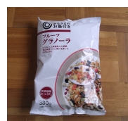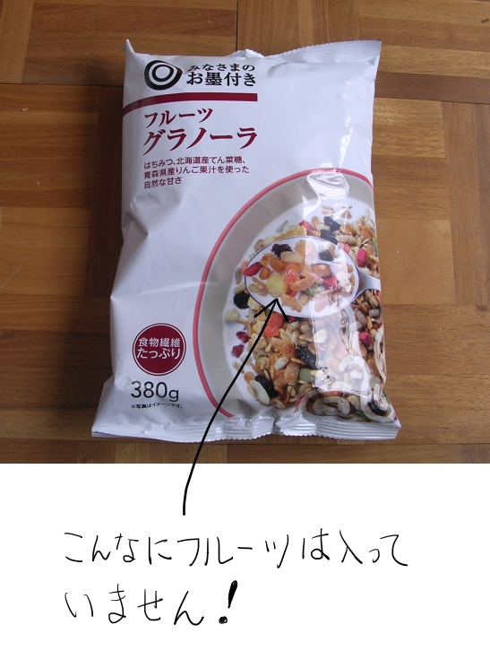 さて、この手のシリアルフードは健康志向の高まりも相まって年々消費量 (comsumption) が増えているらしい。もちろん、カルビーだけでなく数社から同じような商品が販売されているようだ。先日、ときどき行く西友に行ったときに「みなさまののお墨付き」シリーズで「フルーツグラノーラ」という商品が売られていたのを発見してしまった。それで、購入のポイントとなる値段の方だが、カルビーよりも「若干安い」程度でカップ麺ほどの割安感は感じられなかったのだが「試しに買ってみ