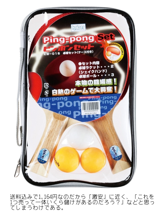 セット・シェイクハンド」である。ラケットが1セット、そして球が3個がビニール製のいかにも安っぽそうなカバーに入っていて、価格は1,164円であった。もちろん「送料込み」なので、ちょっと激安価格に近い。