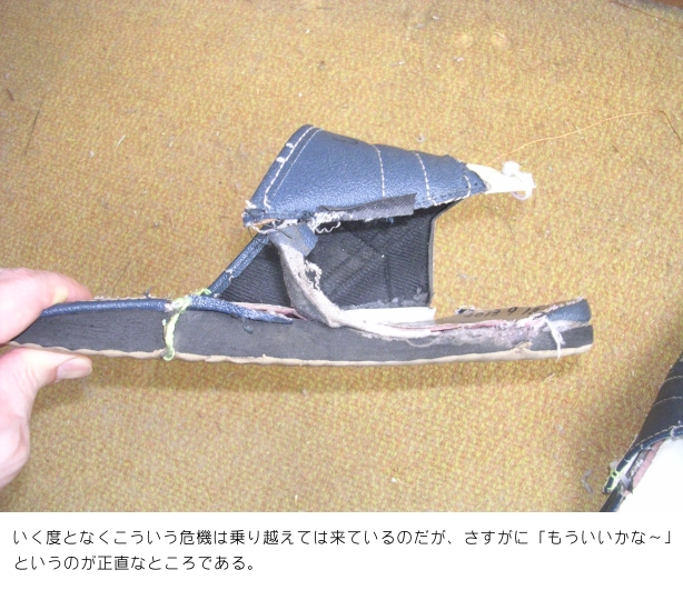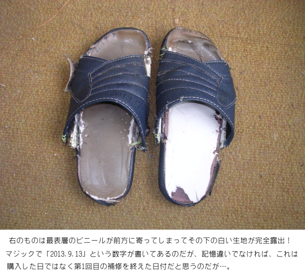 当然、「made in Japan」のわけがなく、中国あたりで大量生産(mass production)されたものに違いない。したがって、長く履き続けられるわけがなく、3ヶ月で縫製した部分が剥がれだしてきた。もう1度そうなってしまうと、あとは「破損の一途」でパカパカ状態になるのに時間がかからなかった。
