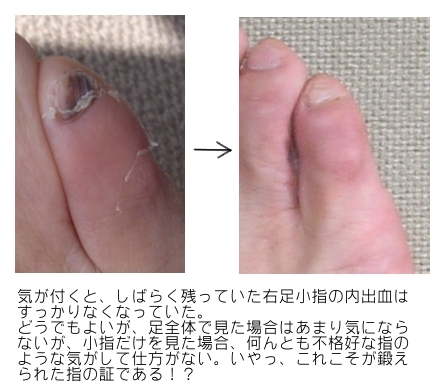 先日、足の爪を切りながら痛めた小指をふと見ると、気になっていた内出血(internal bleeding)もほとんどなくなっていて「元に戻ったな〜」と少し感動してふと思った。「あれっ、そう言えば痛みがすっかりなくなっている」と…。「ある日を境にして痛みがなくなった」という感覚はなく、徐々に消えていったので全く気が付かなかったのであろう。最近は痛めたことも「すっかり