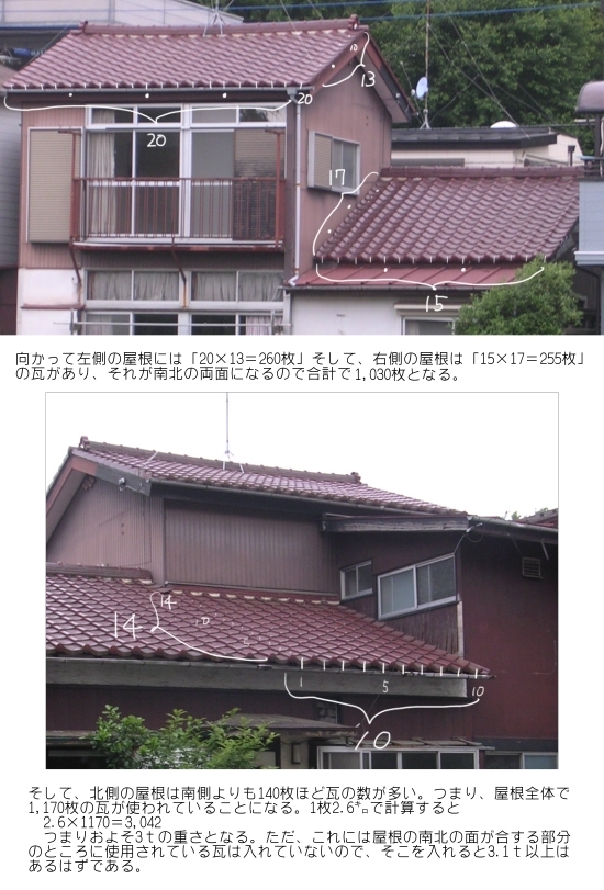 今まではあまり気にしたことがないのだが、「いったい屋根全体でどれくらいの重さなのだろう?」と思い、今回、解体前に撮った写真を元にざっと計算してみると、おそらく瓦だけで3t以上の重さになっているはずである。つまり、ちょっとしたセダンタイ