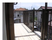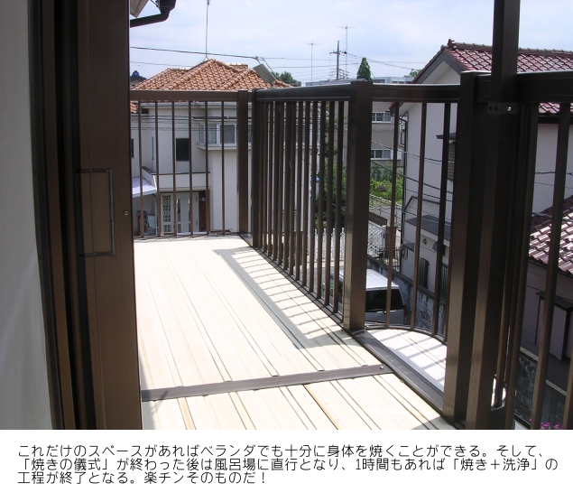 ベランダの幅は約110pでそのすべてに陽が当たるわけではないが、身体を横たえたときに柵などの影が当たるようなことはないので十分に身体を焼くことができる。部屋の窓からは1段高くなっているのだが、ベランダへの出入りもそれほど苦ではない。