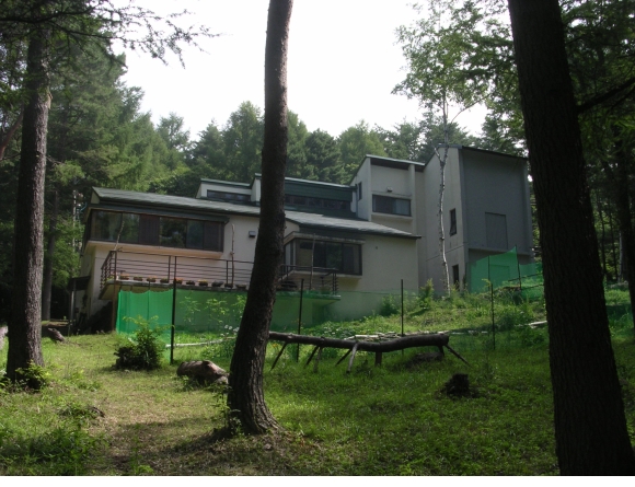 別荘の北側。建物の左端に減築した部分の名残が見られる。「冬は雪はあまり積もらないようだが、気温が低い時には?20℃になることもあるようなので、とてもそんなに寒い時に住みたいとは思わない」ということで、別荘は主に夏場を過ごすために購入したようだ。 先輩のところは、お子さんがいらっしゃらなくご夫婦二人だけなので少し広すぎるくらいの建物になる。正直、元々保養所なので、玄関を入ると10畳ほどのホールがあったり、今は使っていないボイラー室があったりと、「無駄に広い」感は否めない。調理するところも、キッチンというよりは「厨房」に近い。今年なのか去年なのかは分からないが、屋根を業者に塗り替えてもらったようで「200万もかかっちまった!」と嘆いていた。 |