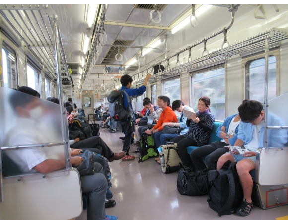 時刻通り電車はホームに入り、ドアのすぐ横の座席を陣取るが、平日にもかかわらず座席の85%くらいは出発時には埋まっている状態だった。 前回の電車は、学校が夏休みに入っているということもあり対面座しきの車両だったが今回は普通の座席の車両であった。