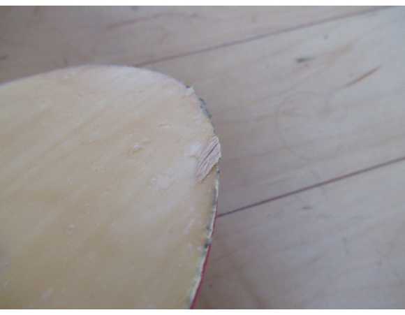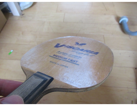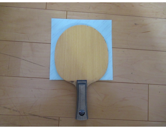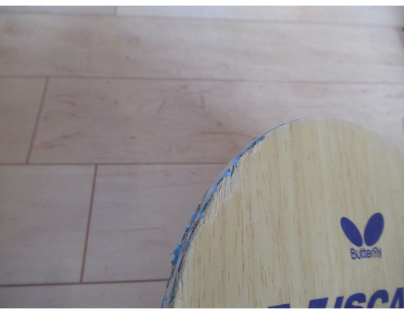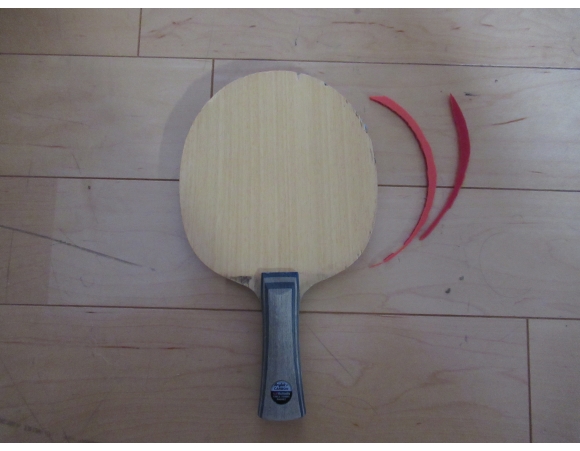もともと貼ってあったラバーを剥がすのはそれほど苦労はしなかったが、一部剥がしたラバーと一緒にラケットの木片がくっついてきてしまった。剥がし方が悪かったというよりは、台にぶつけてすでに本体からはがれた状態だったに違いない。