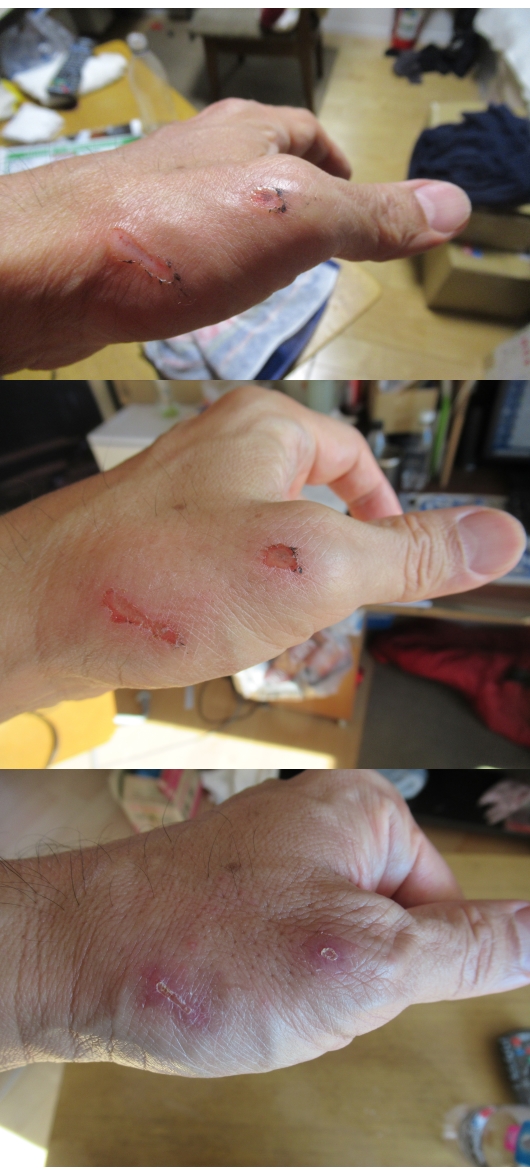 最初は「腕を失うくらいであったら死んだほうがましだ!」と言っていたみたいだが、結局は腕を切断した。今回は自宅でのケガであったので、常備していたアルコールですぐに消毒した。それとは別に、私は小さな容器に消毒用のアルコール (rubbing alcohol) を入れて常にデイパックに入れている。
