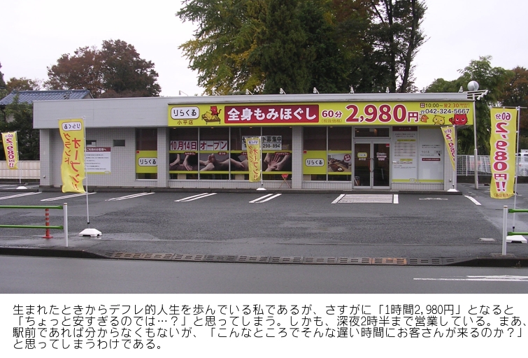 工事も進むにつれて「ここにも整骨院ができるのか?」と一瞬思ったのだが、どうもマッサージ系の店舗だということが判明。そして、「いよいよ開店間近か?」と思えるくらい内外装の工事もほとんど終わりかけてようとしていたときに料金を表す大きな看板が取り付けられたのだが、私はそれを見てビックリしてしまった。なんと「60分2,980円」と大きな文字で書かれた看板が取り付けられたのである。もう価格破壊というよりは「なんでそんな低料金でできるのだろう?ちょっとおかしいだろ