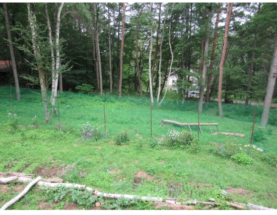 ・建物の前には家庭菜園のスペースが設けてある。ただし、鹿よけのネットは必ず必要となる。去年に比べるとネットが高くなっているような気がしたので、「高くしたのですか?」と聞くと、「ああ、2mくらいはないと飛び越えられる」との返事であった。