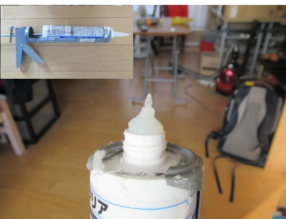 本体となるプラスチックを熱してフラッシュライトの径に合わせて丸めたあとコーキング材を塗布した。