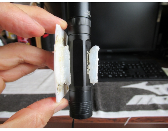 今回作成しようとしているフラッシュライトホルダーを取り付けるのは自転車の前カゴ (front basket) となる。よって、ただ1枚のプラスチックの板をフラッシュライトに合わせて丸めただけではカゴに取りつけるのは難しい。そこで、カゴに取り付けやすいようにもう1枚プラスチック板を利用してみた。そして、もう少し本体とフラッシュライトの密着を高めるためにシリコンコーキング材で「返し」を付けた。