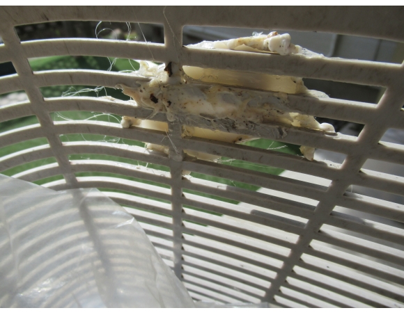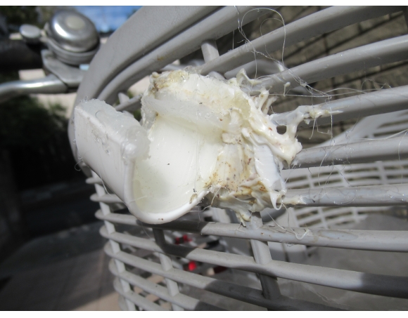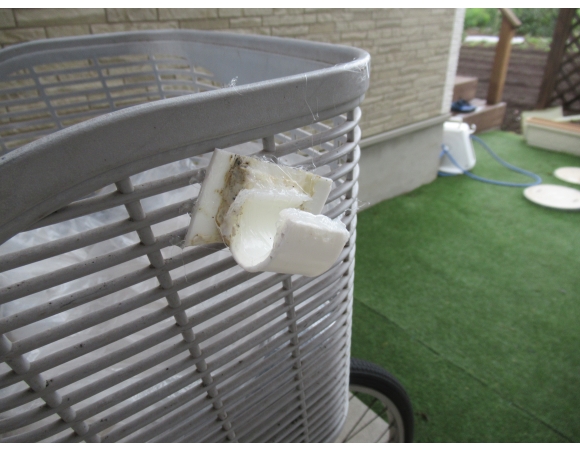 さて、いよいよカゴへの取り付けとなる。まあ、もう一枚同じようなプラスチックの板を用意してネジ (screw) やビス (bis) で留めることも考えたが、面倒くさいそうだったので「グルーガンを使うかっ!」となった。