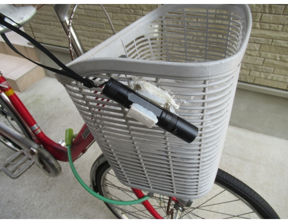 正直、「見栄え」は最悪となったが、カゴとの接着度は強烈となりちょっとくらい力を入れて引っ張ってもうんともすんとも言わない。ただ、大きな振動が加わればフラッシュライトがホルダーから抜けてしまう可能性も無きにしも非ず。よって、実際に使用するときは、以下の写真のように、フラッシュライトについているストラップをブレーキレバーなどに引っかけておくのがベストとなる。
