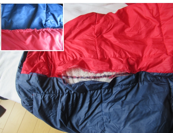 最初、ほころびた部分は化繊の切れ端を使って接着剤 (adhesive) などで対処していたが、足などが当たるところは時間が経つと再び綻びてしまった。よって、得意の?手縫いが1番である。