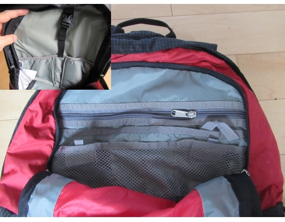 ジッパーが付いている荷室 (luggage space) は2つ。メインのものはパソコンなどが入れられるように2つに分かれている。そして、背の部分の小さな荷室は、小物などが分けて入れられるようにポケットがいくつかついている。そのうちの1つにはジッパーが付いている。そしてメッシュ地のものもあるので、入れるものによって使い分けられるようになっている。