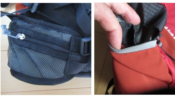 下の写真は左がウエストベルトのメッシュ地のポケット、右はドリンクなどが入れられるサイドポケット(片側は二重になっている)