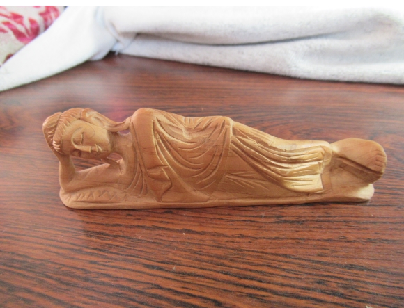 ミャンマーで購入した木彫りの涅槃仏。購入した時は香木 (fragrant wood) を使っているということで、ちょっと墨汁ににたような独特な匂いを放っていたのだが、だんだんと匂いもなくなり現在ではほぼ無臭となってしまった。結局、香木ではなかったのかな〜。