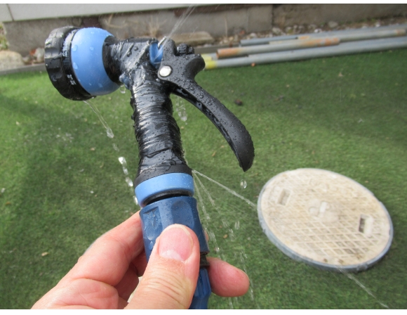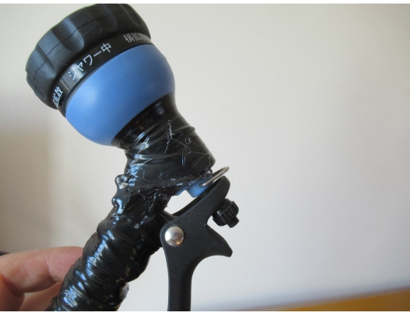 さて、その結果だが、ホースにヘッド部分をセットし、「どうかな〜?」と少しドキドキしながら蛇口の栓をひねった。うっひゃー、見事に惨敗である!けっこう勢いよく水がテープの隙間 (gap) から飛び出してきた。もちろん、何もやらない前に比べればかなり水の勢いは弱まって入るが、これでは正直使えない。「う〜む、なかなか手ごわい!」と思わざるを得なかった。
