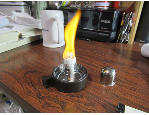燃料用のアルコールは前々から家にあったのでさっそく使ってみた。想像していたよりも炎が大きかったのでちょっとビックリ。まあ、この辺は芯 (wick) である程度の調節はできる (adjustable) はず。どうでもよいが、「アルコールランプって、こんなオレンジ色の炎だったっけ?」という感じがしないでもない。仄かに青い炎を期待していたのだが…。