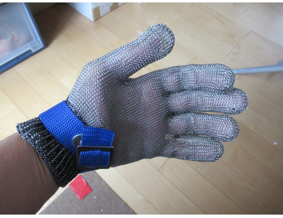 「ちょっとくらいの刃物だったら全く問題ないものを」と思い購入したステンレス鋼メッシュ防護手袋 (protective glove) 。よくよく見ると、細い金属製の糸を撚って作られていて、正直、もう少し頑丈なものを想像していただけに少しガックリ。でも、アマゾンのサイトを見てみる限りは、これ以上頑丈な商品はみつからなかった。