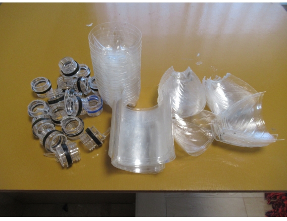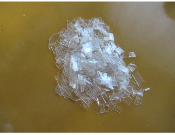 リサイクルしやすいように4分割した本体を、さらに細かくチップ状にする。そして、いずれはこのチップが板状のプラスチックになる予定だが、正直「さて、いつになることやら…」という感じである。