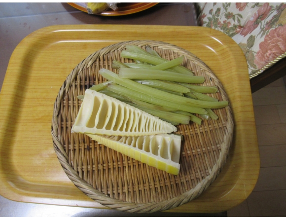 お隣からのおすそ分けの筍 (bamboo shoot) とフキ (Japanese butterbur) 。お隣からはときどきおすそ分けをしていただいて助かっている。